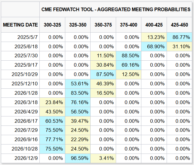 4月20日,CME FedWatch 工具显示的聚合会议概率如下表所示