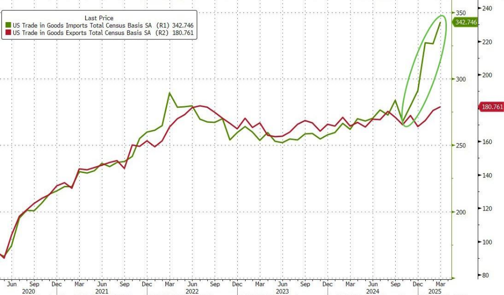 img 具体来看,进口增长了5%,达到3427亿美元,主要由消费品推动,这很可能是由于企业急于在特朗普总统实施大规模关税之前“抢跑”进口商品;同时,非货币黄金的进口也推高了整体进口额。这已经是连续第四个月进口额创下新高。3月份商品出口额增长1.2%,达到1808亿美元 。然而,出口的增长幅度远不及进口的激增,这进一步加剧了贸易逆差。