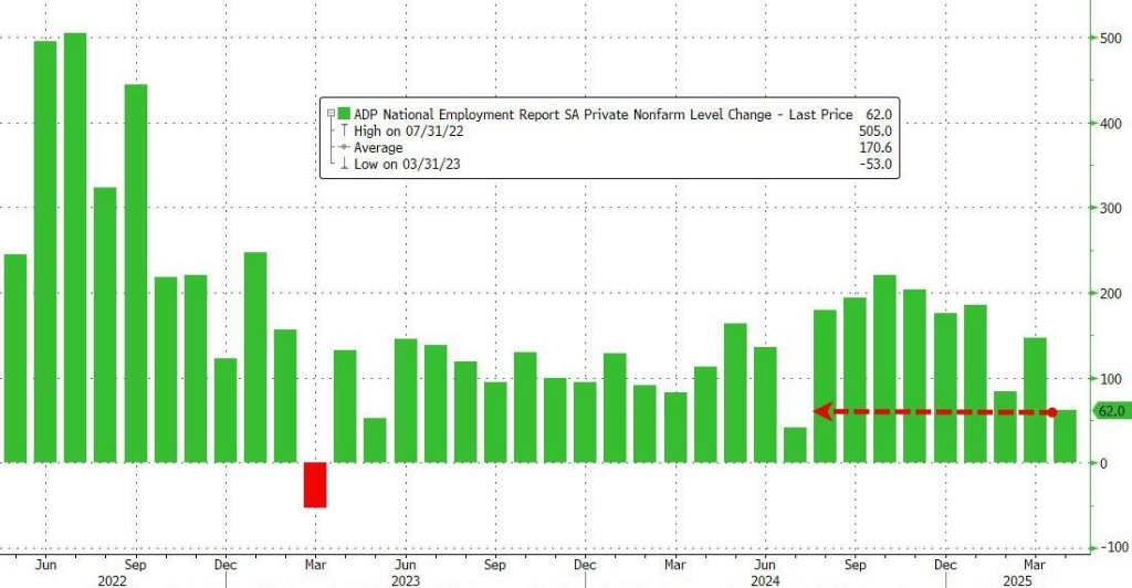 4月30日,ADP Research公布的数据显示美国4月ADP就业人数增长6.2万人,是近九个月以来最慢的增长速度,不及预期的11.5万人,前值为15.5万人。