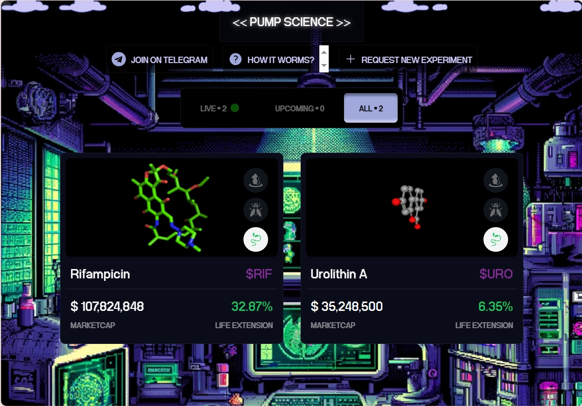 目前,Pump Science上的meme币有分别代表化合物利福霉素的RIF和代表尿石素的URO。RIF市值为107M,URO市值达到35M。