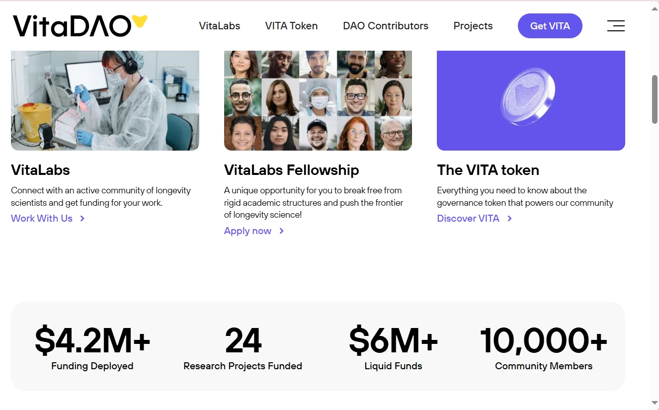 资助长寿研究的DAO集体。特别是自 Vitalik 今年11月在曼谷举行的 Desci Day 活动向 CZ 展示 VitaDAO 研制的第一款产品 VD001 后,VITA 就开启了拉盘。