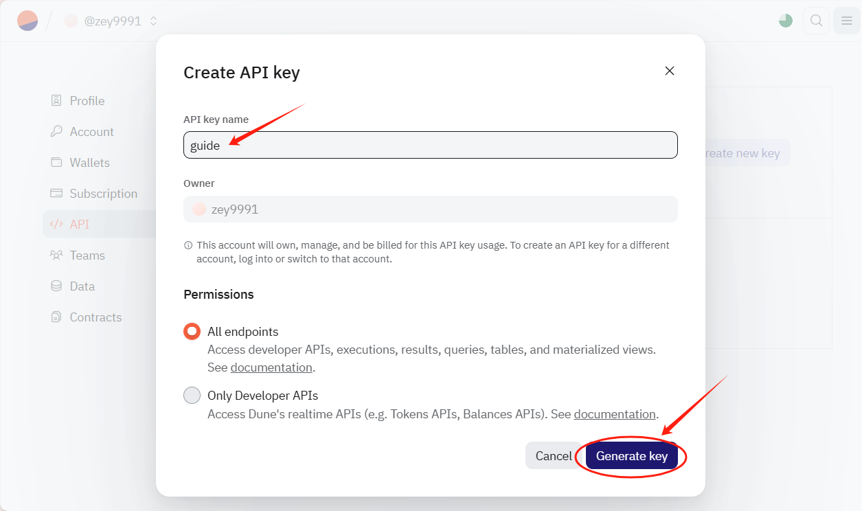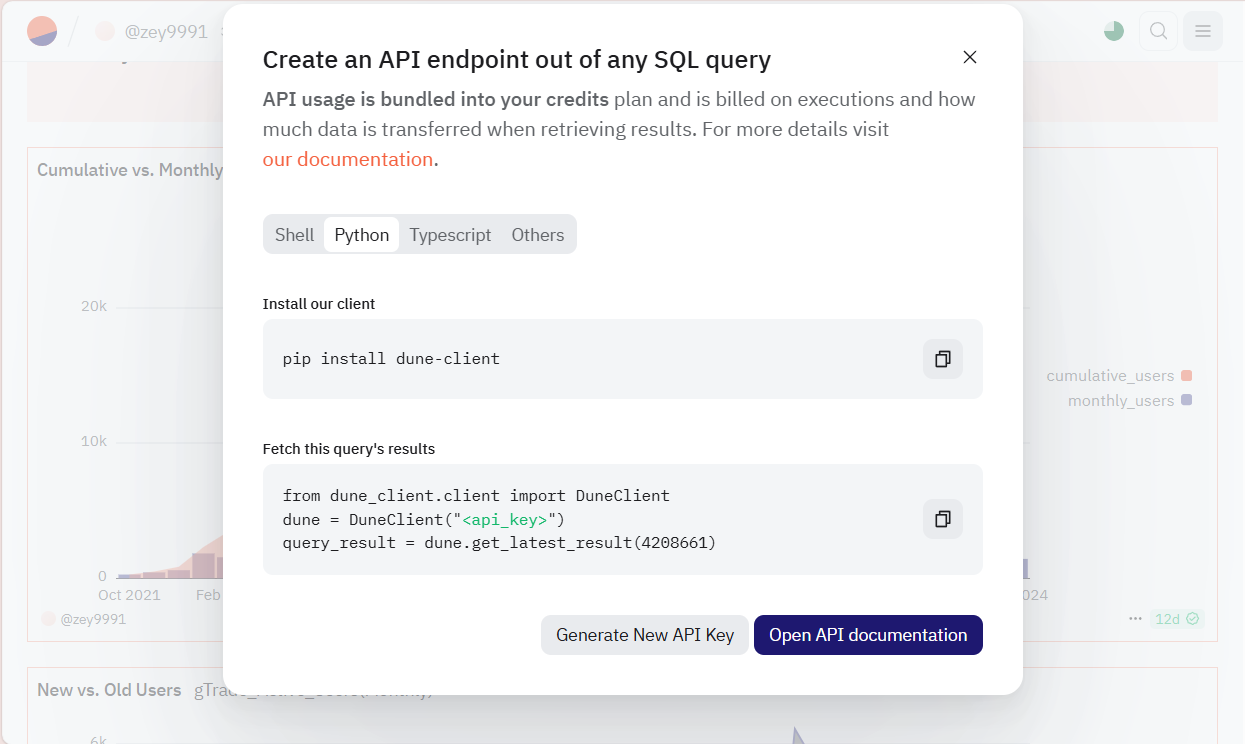 比如,Dune Analytics 除非开通会员,否则不能导出图表数据。但Dune 官方提供了免费额度的 API 调用服务,普通用户只需获取 API Key,便可以以编程方式访问数据,这比截图或手动复制更专业、可控、自动化。